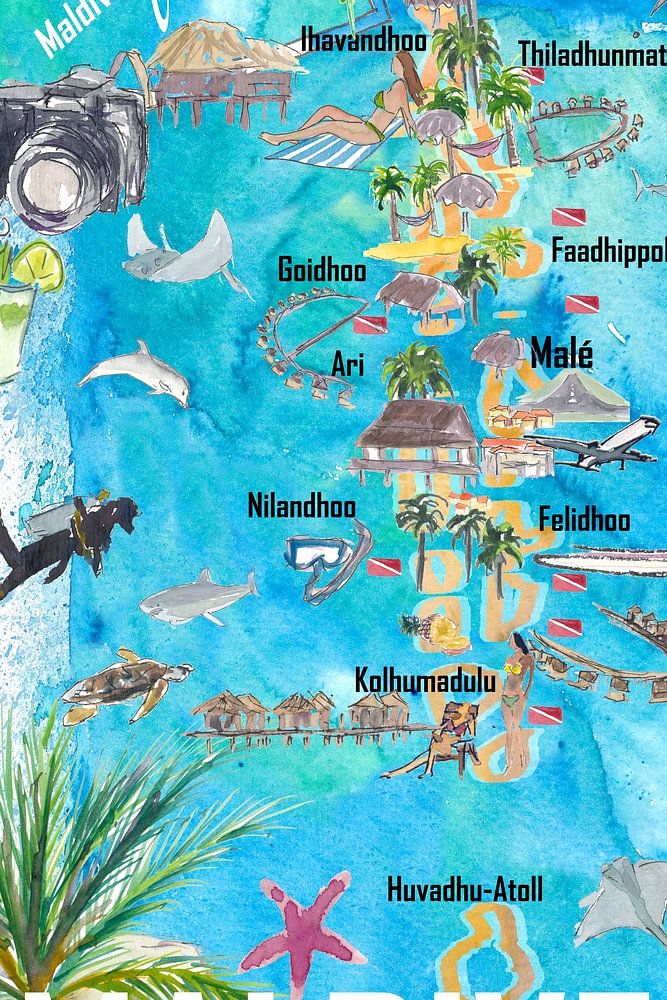 Maldives Islands Illustrated Travel Map with Holiday Dreams and Hideaways by Markus Bleichner