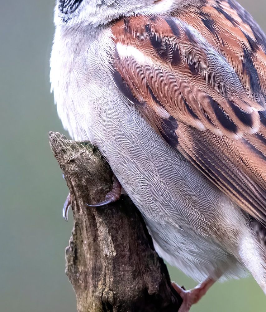 About "Male House Sparrow sitting on a tree trunk"