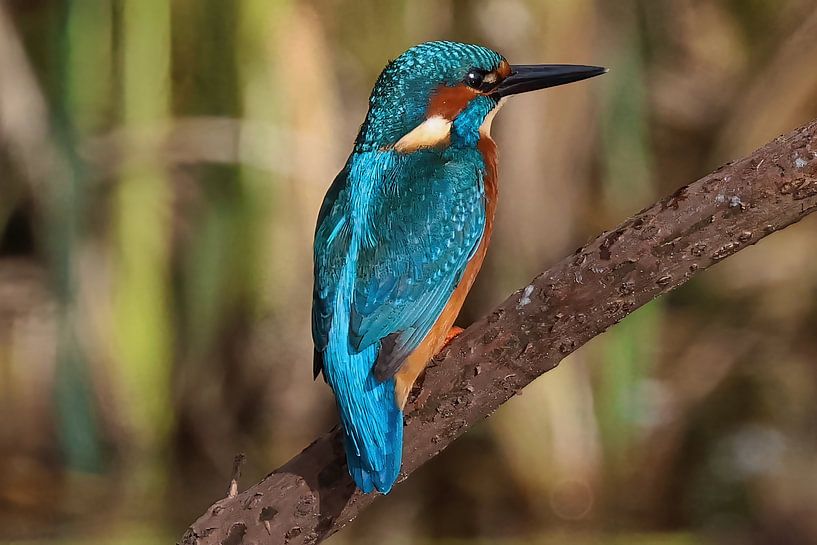 This kingfisher is waiting patiently for a fish to swim past so it can catch it. The white spots on the branch are fish scales. Taken with a Canon camera
