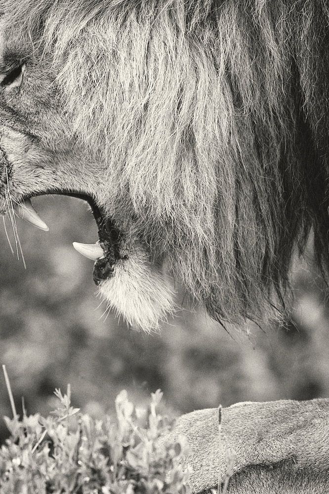 A male Lion with lion's mane lashes out with his lion teeth bared. Photographed at the Masai Mara, Kenya. Black and white.