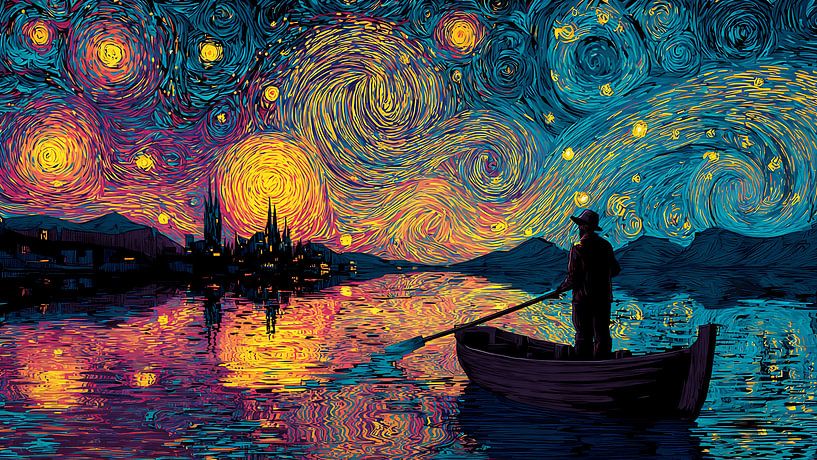 Buy this painting Man Fishing Stars Under Starry Night by Aden Pink Studio as a reproduction on canvas, ArtFrame, poster and wallpaper, printed on demand in high quality.