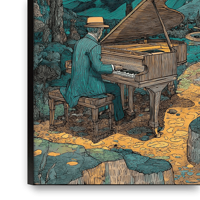 A poetic surreal artwork showing a solitary man playing piano beneath a glowing starry night sky. The swirling stars and dreamy cosmic atmosphere create a peaceful yet mysterious scene filled with imagination and emotion. Designed in a digital art illustration style with flat surrealism colors and a subtle vintage texture, this artwork…