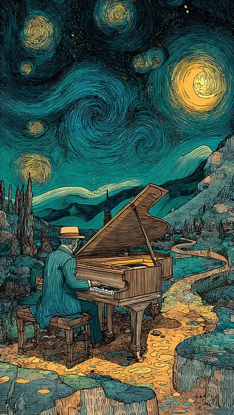 Buy this painting Man Playing Piano Under Starry Night by Aden Pink Studio as a reproduction on canvas, ArtFrame, poster and wallpaper, printed on demand in high quality.
