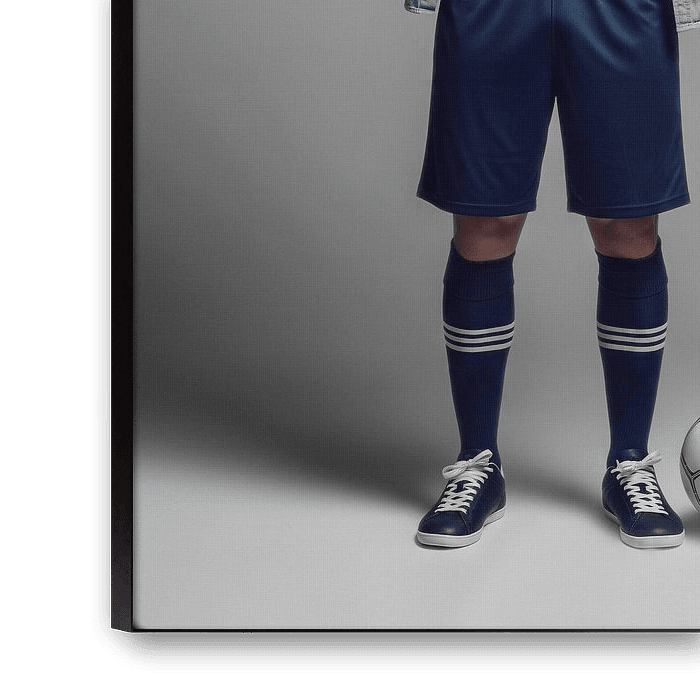Man with six-pack abs, denim shirt, soccer shorts, and soccer ball stands in a studio setting with a gray background.
