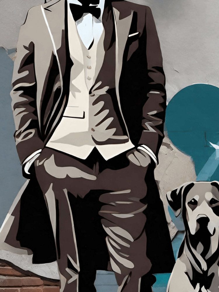 Buy this digital art artwork Man with dog against brick wall by On Your Wall as a reproduction on canvas, ArtFrame, poster and wallpaper, printed on demand in high quality.