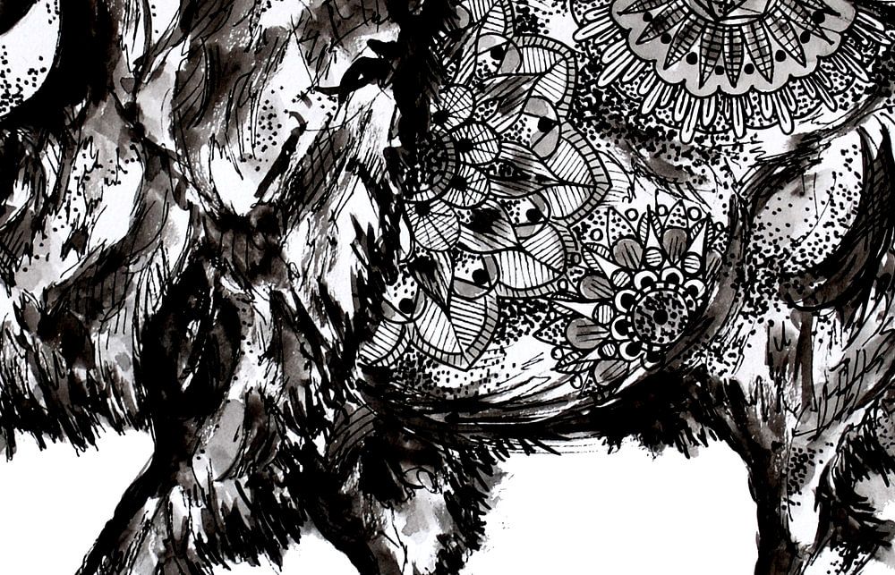 decorative black and white artwork of a big american buffalo with decorative mandala pattern on his back.