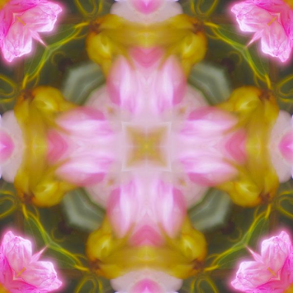 Mandala in soft colours, predominantly pink and green, created from a real image.