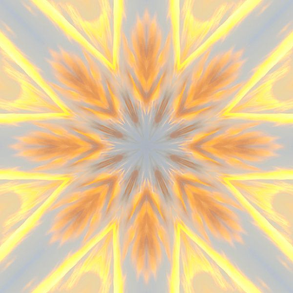 Mandala in soft colours, predominantly yellow and violet, created from a real picture.