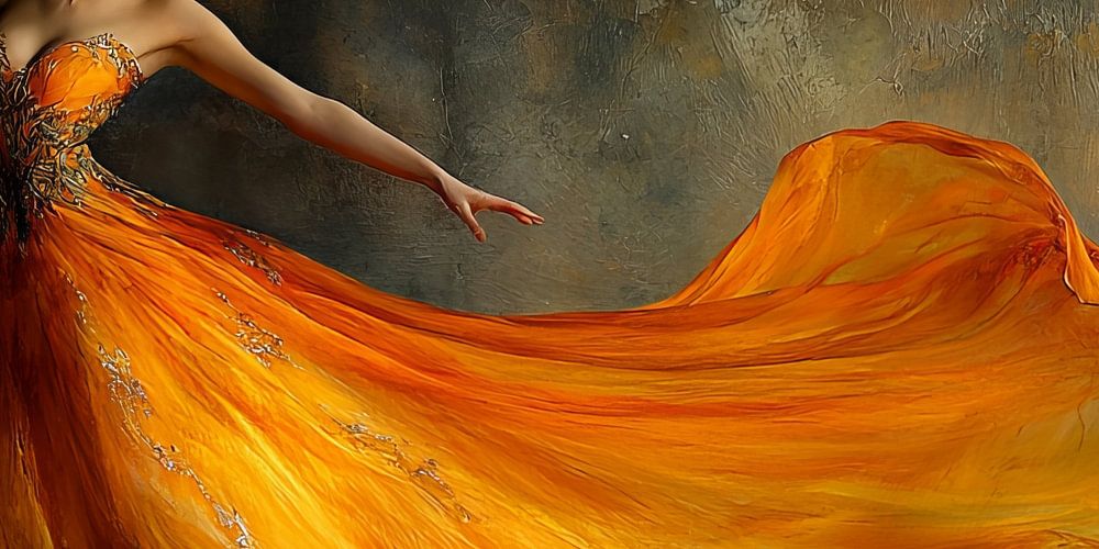 A dancer in a swirling mandarin-colored dress. Elegant, feminine, graceful movement.