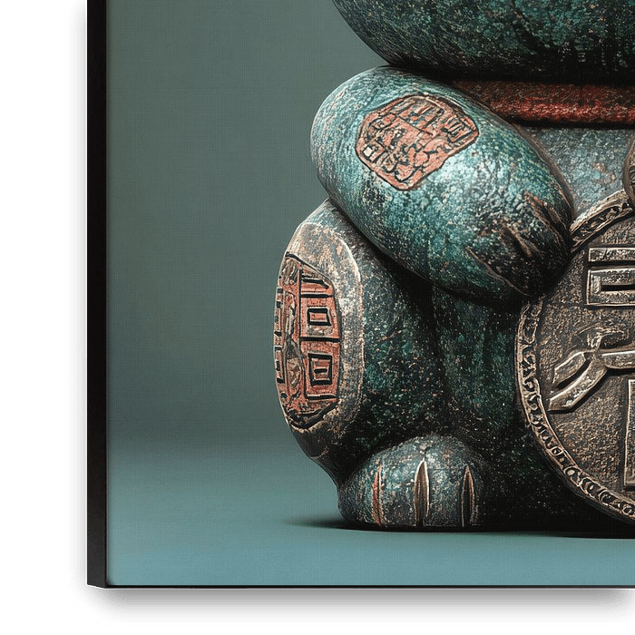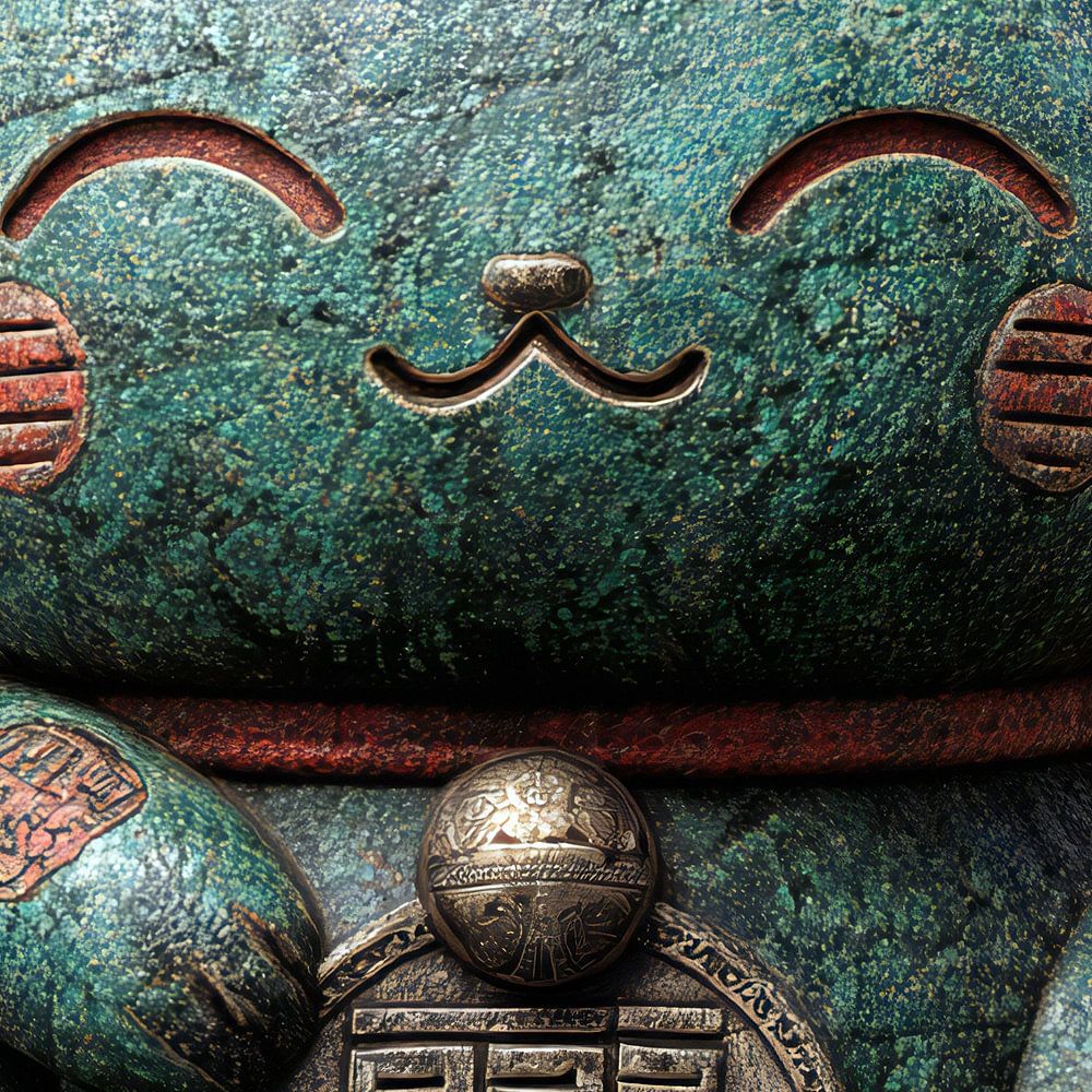 Portrait of a stone Chinese lucky cat, better known as Maneki Neko, an iconic Asian figurine that attracts good fortune, wealth, and customers.