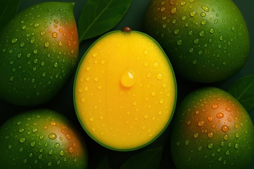 A halved mango with shiny dewdrops takes centre stage between four full fruits and deep green leaves. The bright yellow flesh contrasts strongly with the dark background, while the subtle orange glow on the skin adds warmth. The balanced composition and bright light capture texture and form with razor-sharp precision. This fresh,…