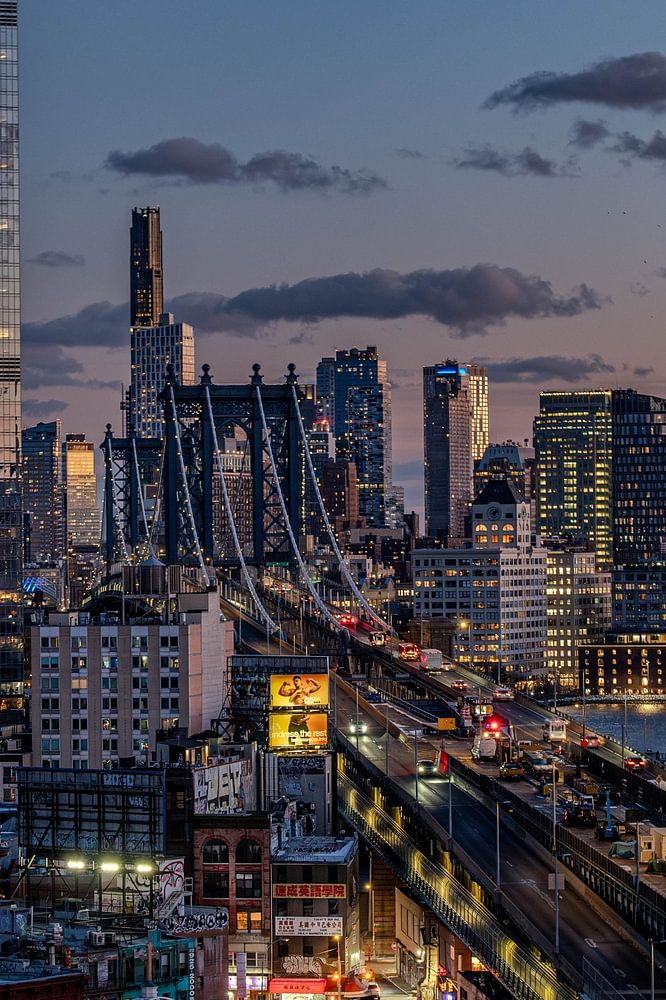 A view of the Manhattan Bridge at blue hour - taken from Chinatown with Brooklyn in the background. The pulsating traffic on the bridge, the illuminated streets of Chinatown and the soft twilight give the scene a unique dynamic. A moment that unites urban life and the architectural beauty of New York.