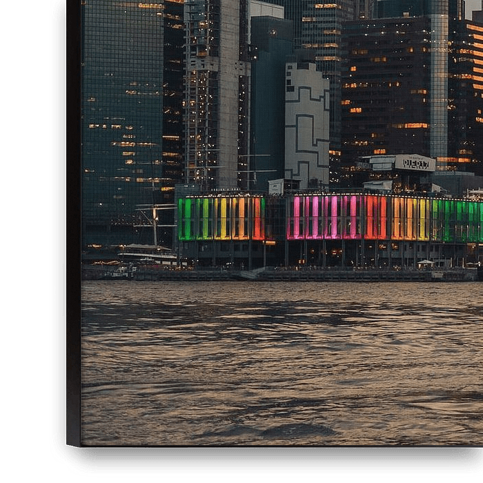 The night-time panorama presents Manhattan with an imposing and colourful skyline, whose skyscrapers and luminaires glitter in the water of the East River. The extraordinarily illuminated building on the waterfront shines in the colours of the rainbow and, together with the surrounding skyscrapers, forms a composition that symbolises…