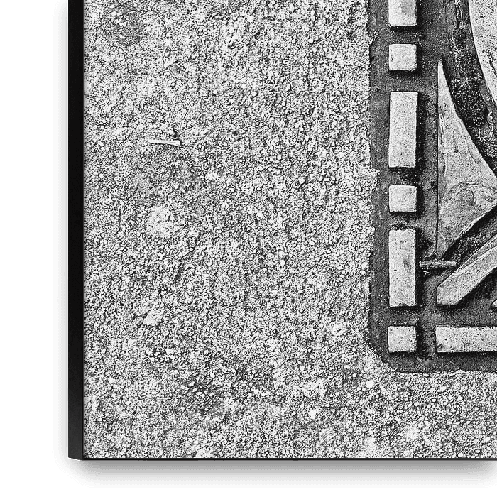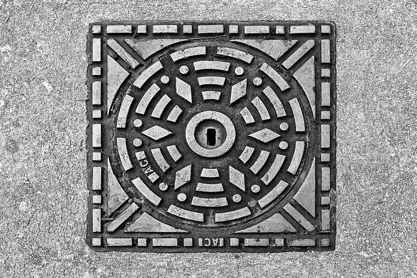 A geometric manhole cover in Verdun, captured in black and white. The pattern appears almost symmetrical and stands out sharply against the weathered concrete. I love these kinds of quiet details in a city.