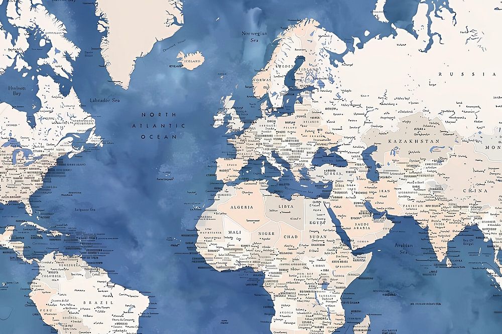 Map Blue and beige watercolor detailed world map by Artwork Shop