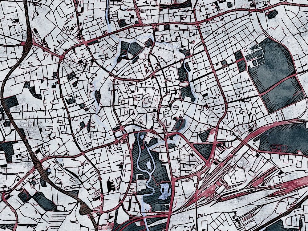 This map of Braunschweig has our custom made style "White winter". The dark red streets form warm veins in the cold snow covered landscape. While the vegetation is preparing itself leafless for the coming spring. This wintery map of Braunschweig will give your interior a refreshing look.
