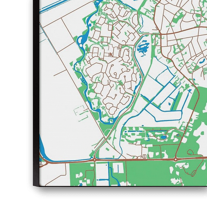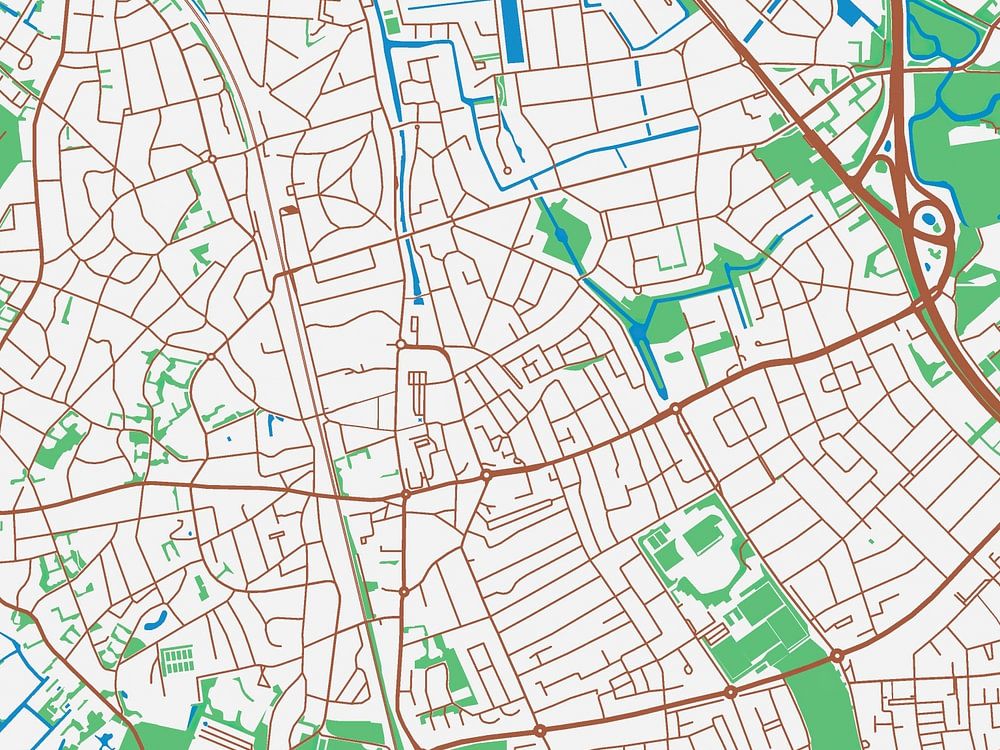 Explore Bussumwith this map in the style of Urban Ivory. With a color palette consisting of white, red, green, and blue, this map brings Bussum to life. Each element on the map has been carefully chosen and given a traditional color, making them stand out against the bright white background.