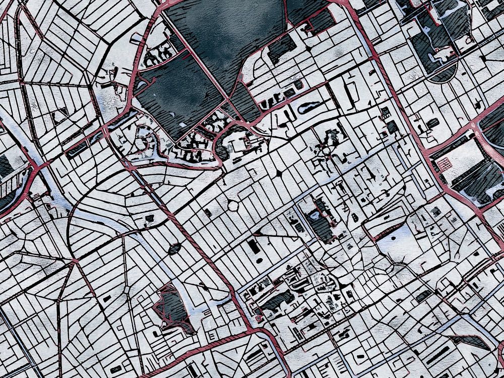 This map of Den Haag has our custom made style "White winter". The dark red streets form warm veins in the cold snow covered landscape. While the vegetation is preparing itself leafless for the coming spring. This wintery map of Den Haag will give your interior a refreshing look.