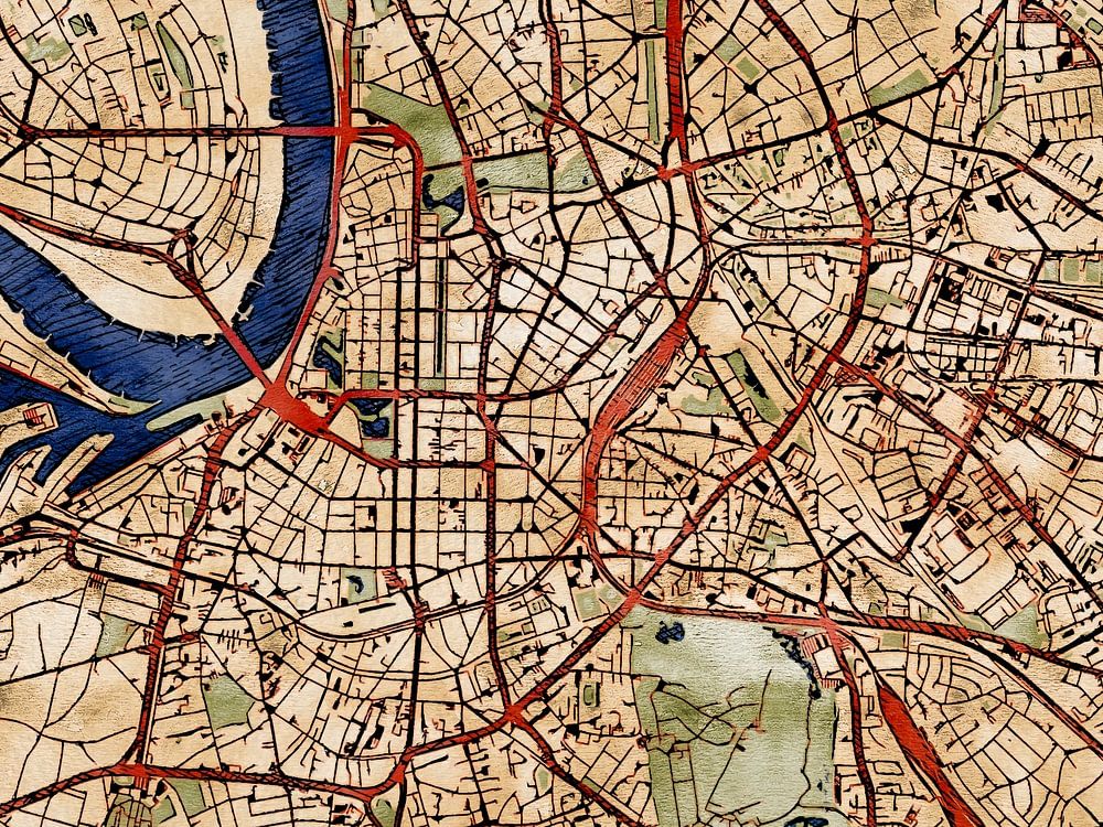This map of Düsseldorf features our custom style “Serene Summer”. This style is characterised by the warm, sun-drenched earthy tones. The color palette is inspired by the Art Nouveau style of the turn of the century. This map of Düsseldorf gives your interior a classic, modern look.