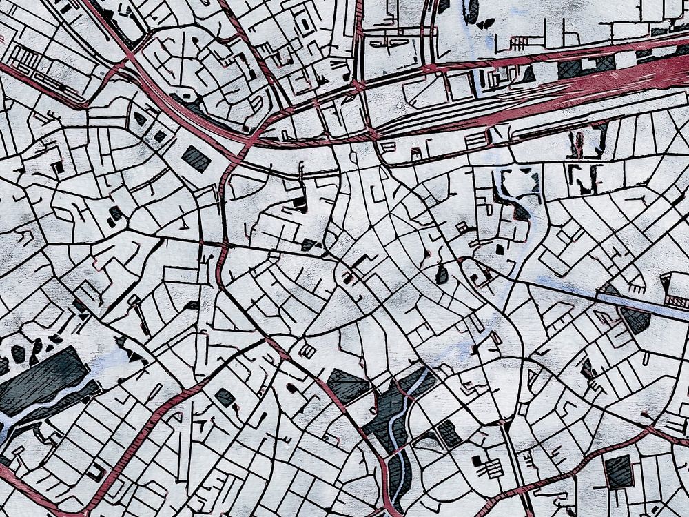 This map of Eindhoven has our custom made style "White winter". The dark red streets form warm veins in the cold snow covered landscape. While the vegetation is preparing itself leafless for the coming spring. This wintery map of Eindhoven will give your interior a refreshing look.
