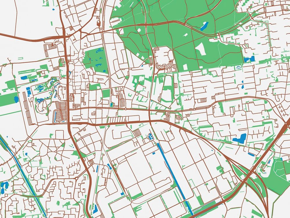 Explore Emmenwith this map in the style of Urban Ivory. With a color palette consisting of white, red, green, and blue, this map brings Emmen to life. Each element on the map has been carefully chosen and given a traditional color, making them stand out against the bright white background.
