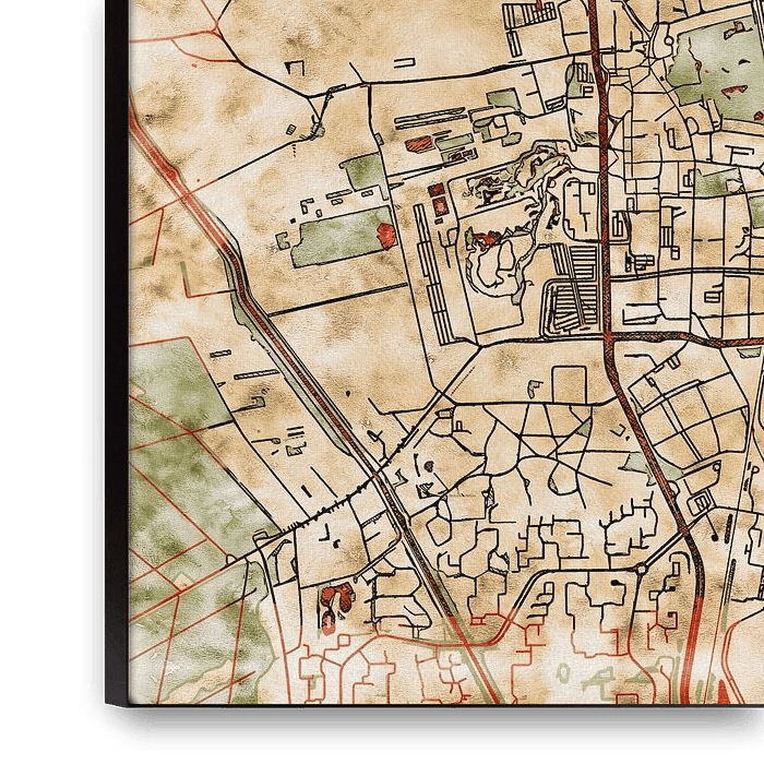 This map of Emmen features our custom style “Serene Summer”. This style is characterised by the warm, sun-drenched earthy tones. The color palette is inspired by the Art Nouveau style of the turn of the century. This map of Emmen gives your interior a classic, modern look.