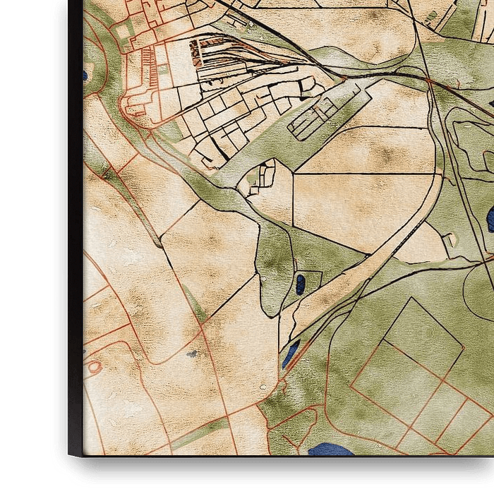 This map of Frechen features our custom style “Serene Summer”. This style is characterised by the warm, sun-drenched earthy tones. The color palette is inspired by the Art Nouveau style of the turn of the century. This map of Frechen gives your interior a classic, modern look.