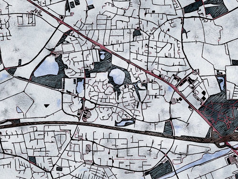 This map of Garbsen has our custom made style "White winter". The dark red streets form warm veins in the cold snow covered landscape. While the vegetation is preparing itself leafless for the coming spring. This wintery map of Garbsen will give your interior a refreshing look.