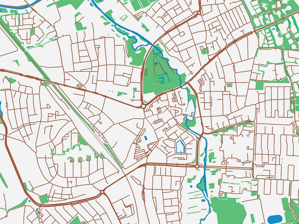 Explore Geldropwith this map in the style of Urban Ivory. With a color palette consisting of white, red, green, and blue, this map brings Geldrop to life. Each element on the map has been carefully chosen and given a traditional color, making them stand out against the bright white background.