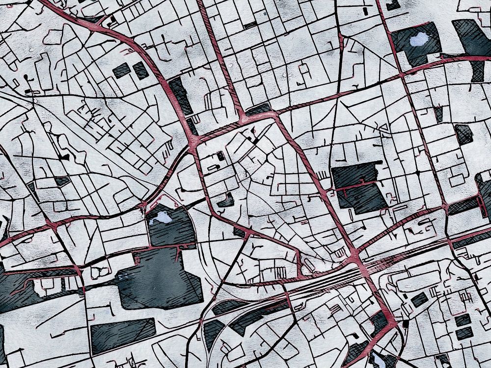 This map of Gelsenkirchen has our custom made style "White winter". The dark red streets form warm veins in the cold snow covered landscape. While the vegetation is preparing itself leafless for the coming spring. This wintery map of Gelsenkirchen will give your interior a refreshing look.