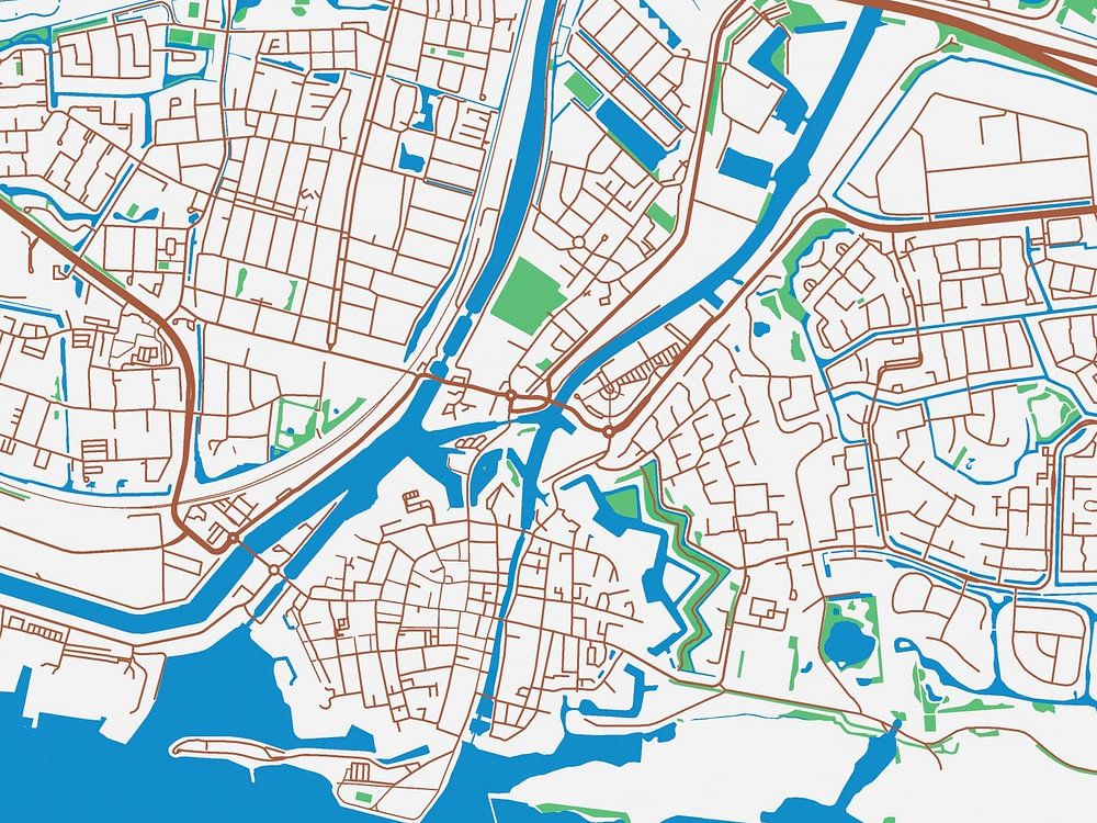 Explore Gorinchemwith this map in the style of Urban Ivory. With a color palette consisting of white, red, green, and blue, this map brings Gorinchem to life. Each element on the map has been carefully chosen and given a traditional color, making them stand out against the bright white background.