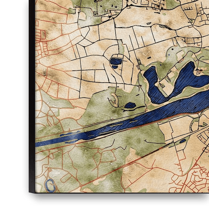 This map of Ingolstadt features our custom style “Serene Summer”. This style is characterised by the warm, sun-drenched earthy tones. The color palette is inspired by the Art Nouveau style of the turn of the century. This map of Ingolstadt gives your interior a classic, modern look.
