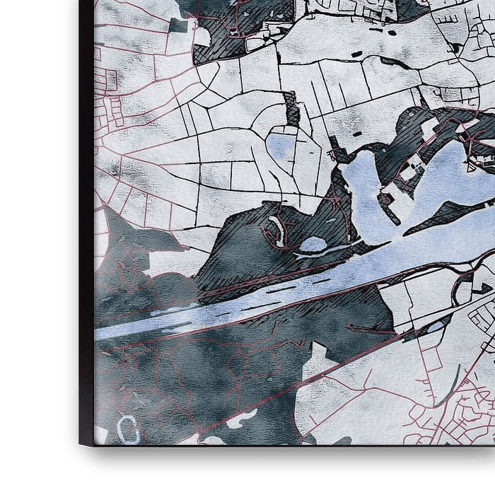 This map of Ingolstadt has our custom made style "White winter". The dark red streets form warm veins in the cold snow covered landscape. While the vegetation is preparing itself leafless for the coming spring. This wintery map of Ingolstadt will give your interior a refreshing look.