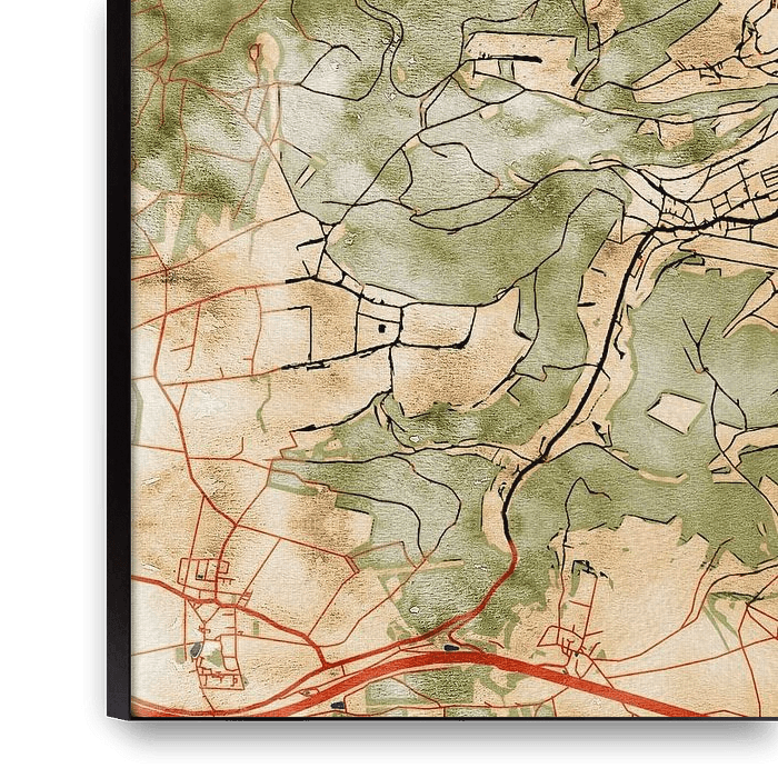 This map of Jena features our custom style “Serene Summer”. This style is characterised by the warm, sun-drenched earthy tones. The color palette is inspired by the Art Nouveau style of the turn of the century. This map of Jena gives your interior a classic, modern look.