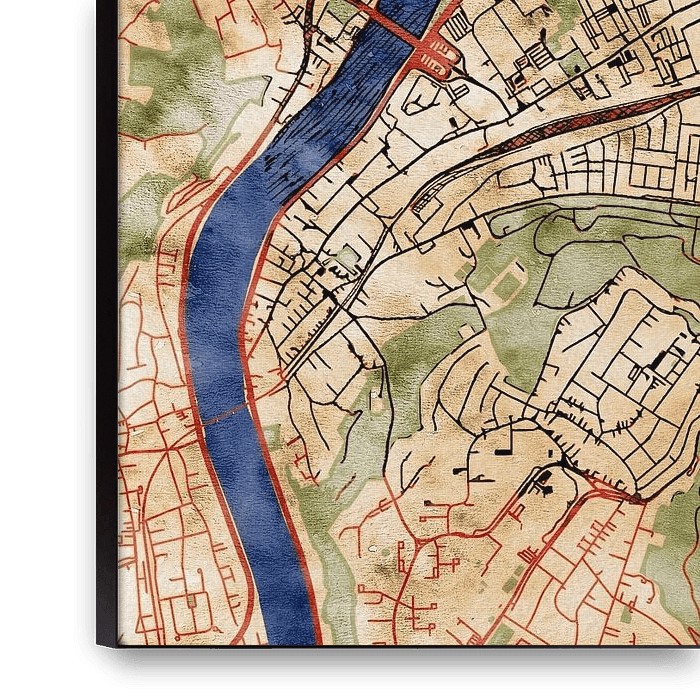 This map of Koblenz center features our custom style “Serene Summer”. This style is characterised by the warm, sun-drenched earthy tones. The color palette is inspired by the Art Nouveau style of the turn of the century. This map of Koblenz center gives your interior a classic, modern look.