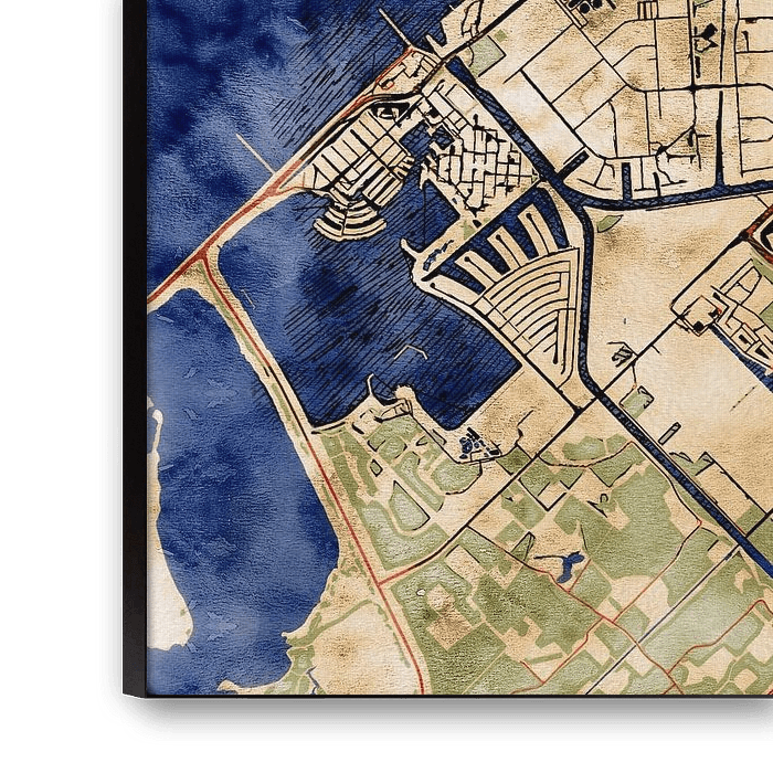 This map of Lelystad features our custom style “Serene Summer”. This style is characterised by the warm, sun-drenched earthy tones. The color palette is inspired by the Art Nouveau style of the turn of the century. This map of Lelystad gives your interior a classic, modern look.