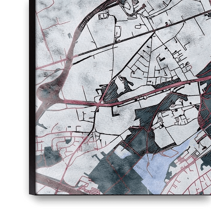 This map of Leuven has our custom made style "White winter". The dark red streets form warm veins in the cold snow covered landscape. While the vegetation is preparing itself leafless for the coming spring. This wintery map of Leuven will give your interior a refreshing look.
