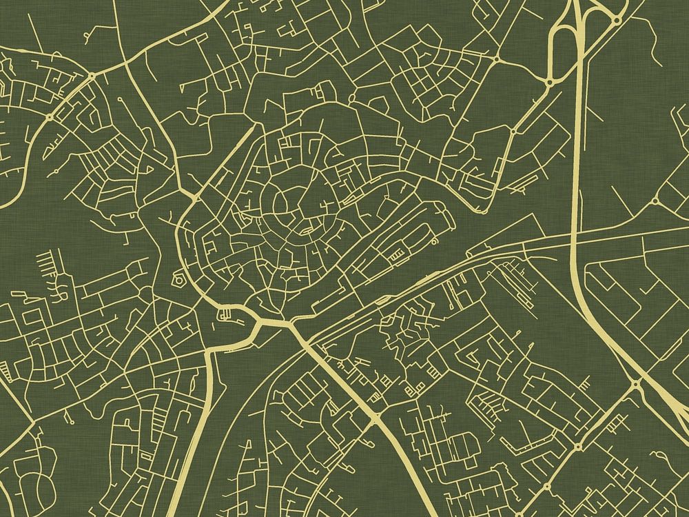 Explore Middelburg with this map in our Green Gold style. The golden yellow roads contrast against a green background. Combined with a subtle linen texture, this map adds a touch of refinement and tranquility to any space where it is displayed.