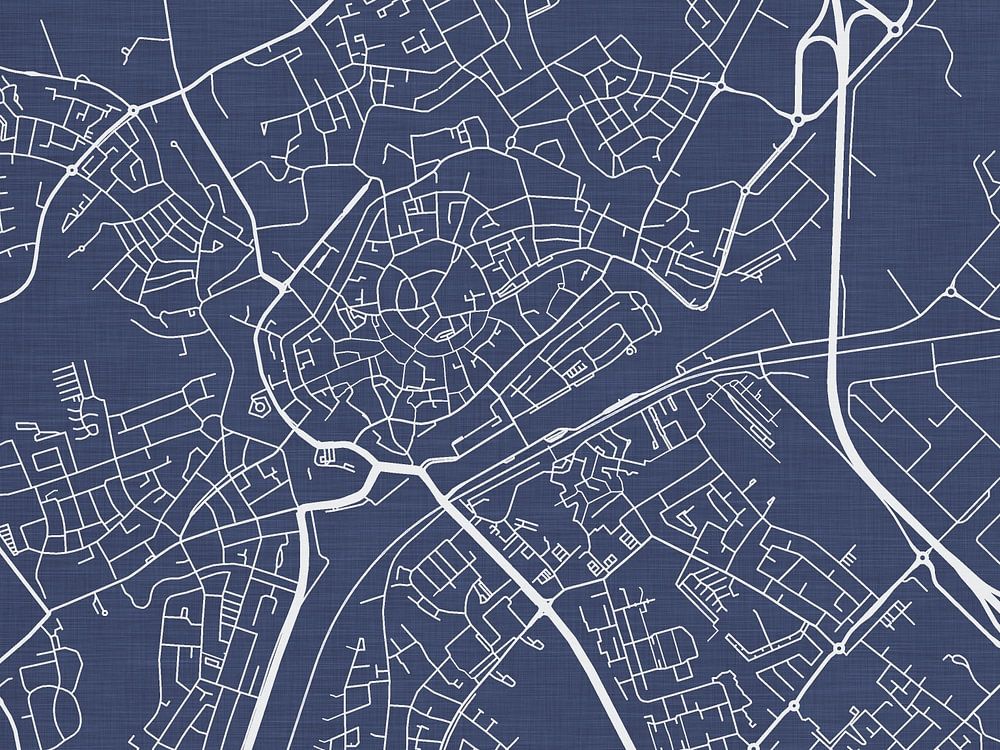 Explore Middelburg with this map in the Royal Blue style. The white roads contrast against a deep blue background. Combined with a subtle linen texture, this map adds a touch of refinement and tranquility to any space where it is displayed.