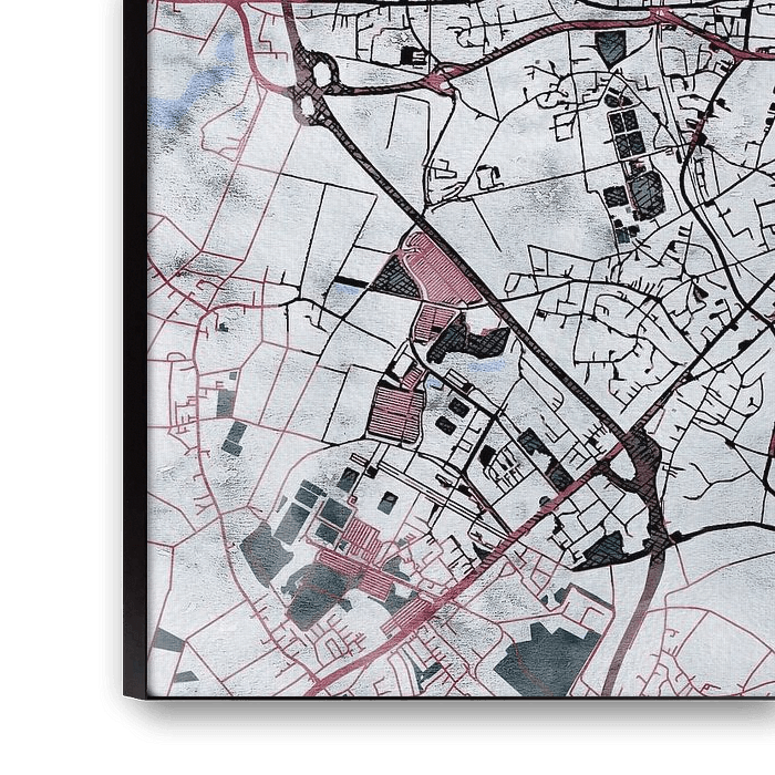 This map of Mönchengladbach has our custom made style "White winter". The dark red streets form warm veins in the cold snow covered landscape. While the vegetation is preparing itself leafless for the coming spring. This wintery map of Mönchengladbach will give your interior a refreshing look.