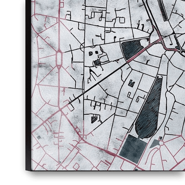 This map of München centrum has our custom made style "White winter". The dark red streets form warm veins in the cold snow covered landscape. While the vegetation is preparing itself leafless for the coming spring. This wintery map of München centrum will give your interior a refreshing look.