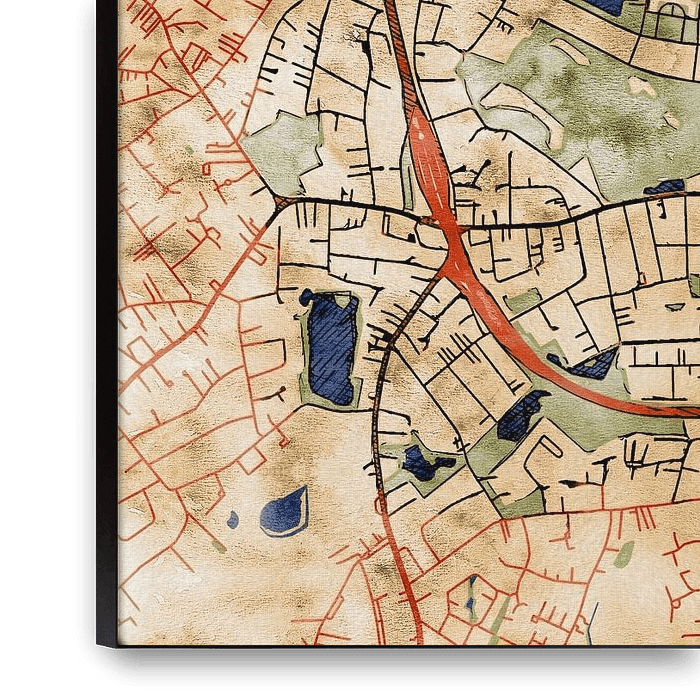 This map of Oldenburg centrum features our custom style “Serene Summer”. This style is characterised by the warm, sun-drenched earthy tones. The color palette is inspired by the Art Nouveau style of the turn of the century. This map of Oldenburg centrum gives your interior a classic, modern look.