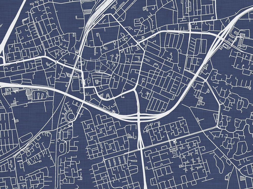 Explore Roosendaal with this map in the Royal Blue style. The white roads contrast against a deep blue background. Combined with a subtle linen texture, this map adds a touch of refinement and tranquility to any space where it is displayed.