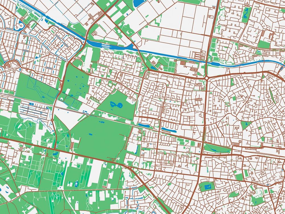 Explore Tilburgwith this map in the style of Urban Ivory. With a color palette consisting of white, red, green, and blue, this map brings Tilburg to life. Each element on the map has been carefully chosen and given a traditional color, making them stand out against the bright white background.