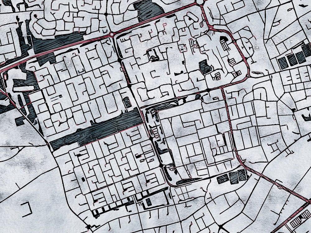 This map of Veldhoven has our custom made style "White winter". The dark red streets form warm veins in the cold snow covered landscape. While the vegetation is preparing itself leafless for the coming spring. This wintery map of Veldhoven will give your interior a refreshing look.