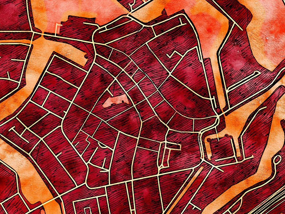 This map of Woerden centrum has our custom made style “Amber Autumn". It's got the natural colours of the season, inspired by autumn leaves. The earthy tones of this map of Woerden centrum will give your interior a warm look.