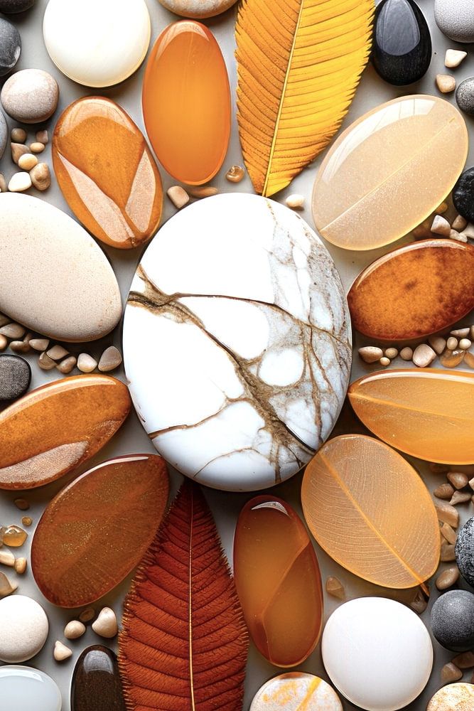 The contrasts between the shiny marble, the vibrant autumn tones and the varied pebbles create a visual spectacle. The whole rests on an off-white background, giving the scene a calm and subdued look. This image is a celebration of natural splendour and an invitation to appreciate the complexity and beauty of the world around us.