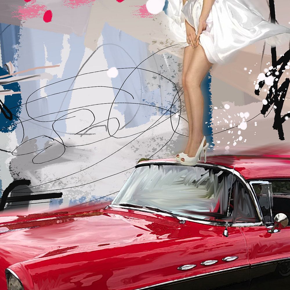Buy this digital art artwork Marelyn and the vintage car by Nicole Habets as a reproduction on canvas, ArtFrame, poster and wallpaper, printed on demand in high quality.