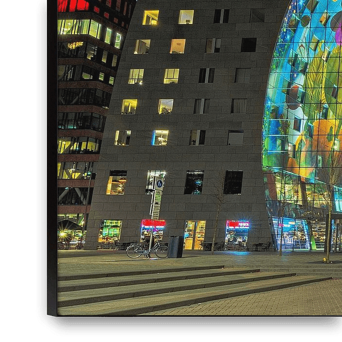 The first covered food market in the Netherlands. Especially in the evening extra beautiful because of the lighting on the beautiful colored glass panels. This is located near the train station Rotterdam Blaak.