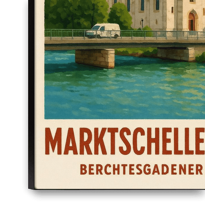 This city poster depicts the charming scenery of Marktschellenberg with its striking church rising above the riverbank. A bridge spans the clear water, while colourful houses and green hills form the backdrop. The stylised and textured design is based on our own photographs and has been digitally altered to graphically capture the…